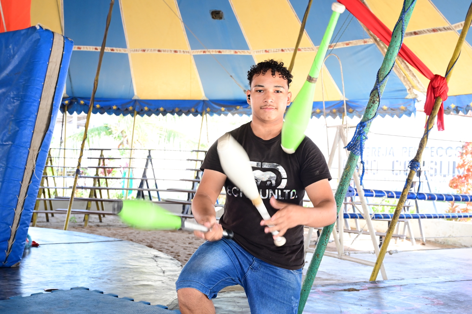 Entre os jovens artistas do Circo Escola, Elionai dos Santos, de 15 anos, carrega no olhar o brilho de quem descobriu no circo um caminho de transformação. “Eu conheci o circo vendo um espetáculo à noite. Achei tudo muito bonito e fiquei encantado com os malabares. Aprendi com o meu irmão e com o professor Manuel, e hoje também sou apaixonado por acrobacia em dueto. Amo muito esse circo, ele mudou minha vida”, conta.