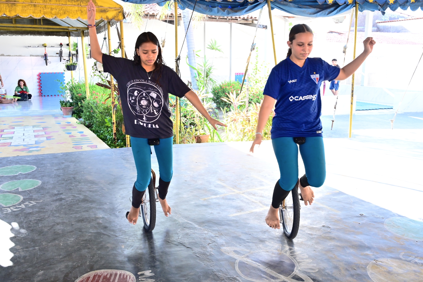 As adolescentes Maria Elisa Rodrigues (14) e Maria Riandra Lima (15) também se preparam para subir ao palco com o grupo do Circo Escola do Bom Jardim. Para elas, o projeto vai muito além da arte. “O circo abriu meus olhos pra muita coisa. Aqui a gente não aprende só a parte artística, mas também sobre convivência e respeito”, conta Maria Elisa.